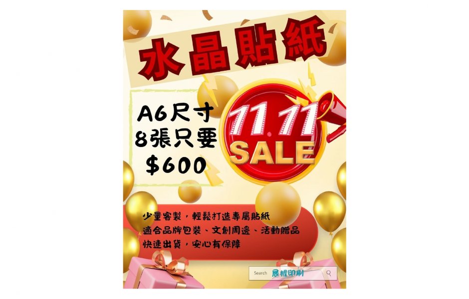 雙11限時優惠提前開跑!活動期間 即日起至 2025/11/28, 水晶貼紙 A6尺寸 ~ 8張只要 $600 什麼~也太下殺了吧! 少量客製,輕鬆打造專屬貼紙 適合品牌包裝、文創周邊、活動贈品 快速出貨,安心有保障! 歡迎加入官方line洽詢