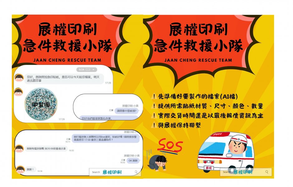 啊!!對了~快來找「展權印刷」 他們應該能解決我的問題!是不是常常有臨時需要用到貼紙的時候?這時候不要猶豫快找展權就對了!!
